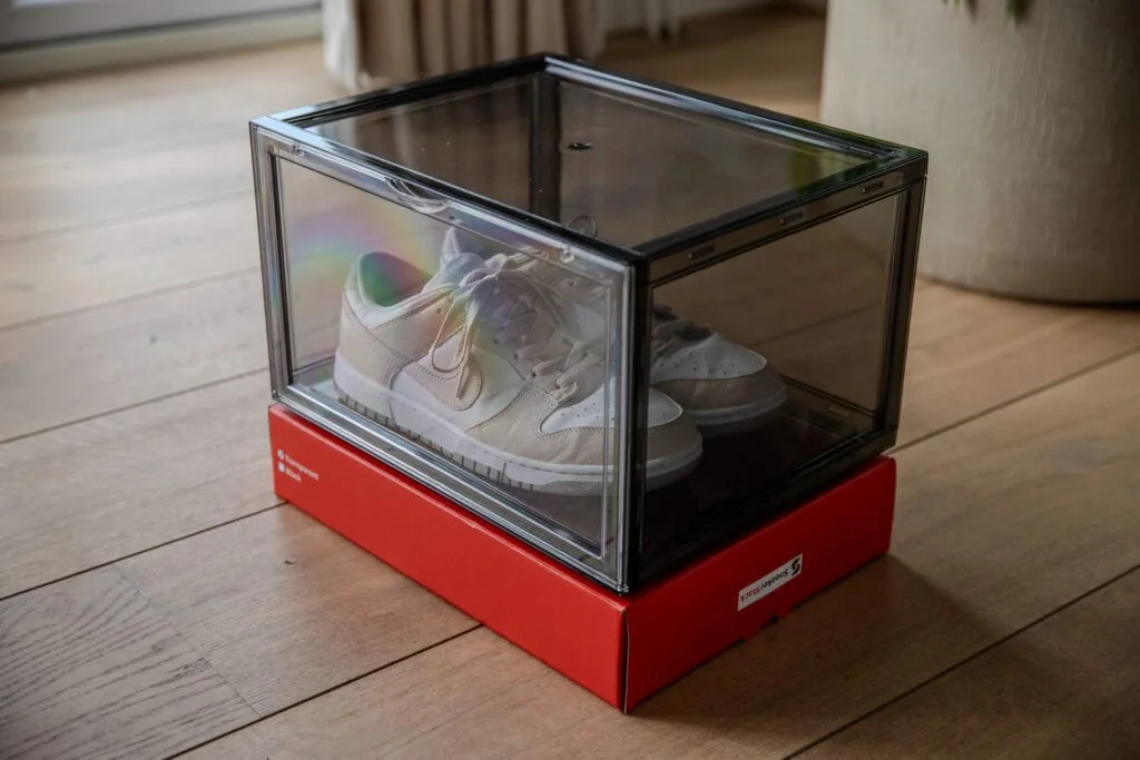 Transparent acrylic and glass are popular materials for sneaker box black. They offer a clear view of your sneakers while protecting them from dust and dirt. For extra sturdiness and a luxurious look, you can choose a wooden or metal frame.
